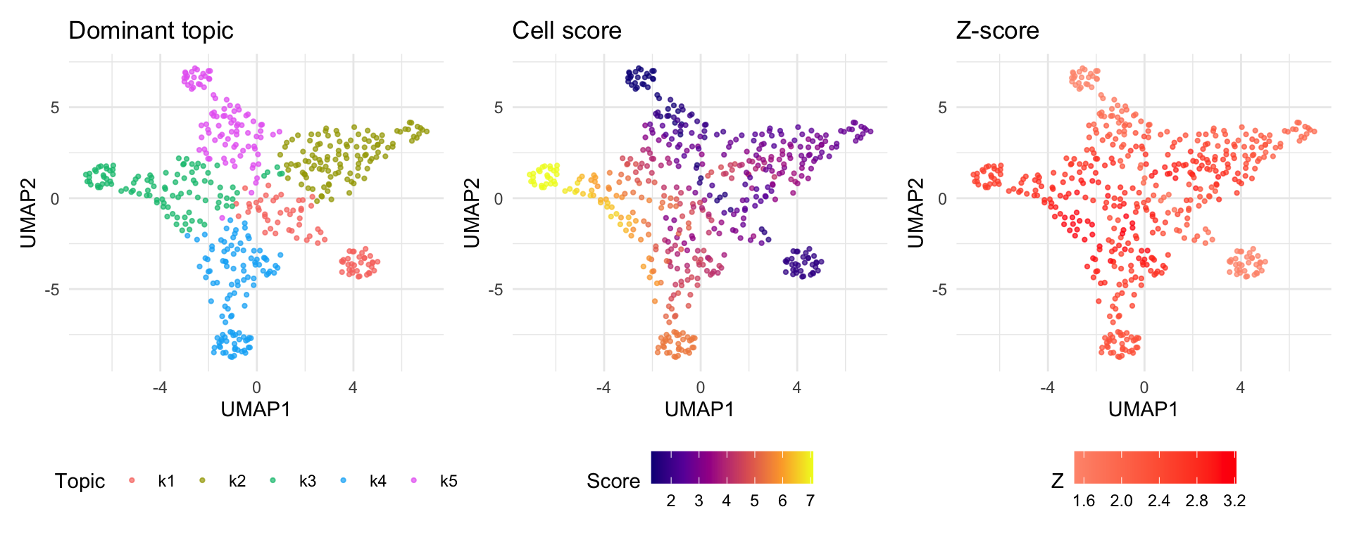 Cells dominated by topics with high enrichment (e.g., k3, k4) show elevated scores, while cells in low-enrichment topics score near the baseline.